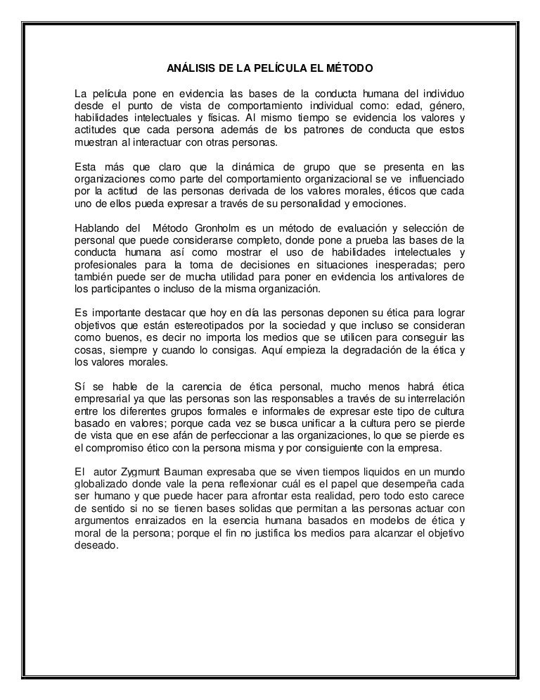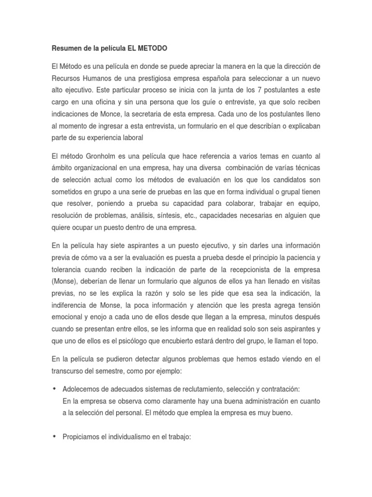 Página 1 de 8. ANÁLISIS DE LOS PERSONAJES DE LA PELÍCULA "EL MÉTODO". La película se trata de un grupo de candidatos o aspirantes a un puesto en una empresa y son convocados a la misma hora y en el mismo lugar. El planteo es simple y cruel. Siete postulantes son convocados a cubrir un alto puesto ejecutivo, a la misma hora y en el.