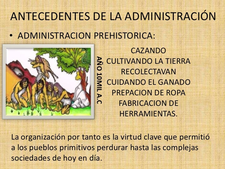 El pensamiento administrativo, como la humanidad, ha evolucionado desde la prehistoria y los cavernícolas hasta la historia moderna, los viajes a la luna, las computadoras e internet. La evolución de la administración se remonta a los tiempos de nuestros antepasados cazadores-recolectores, quienes, en tribus de hasta 150 individuos, debieron.