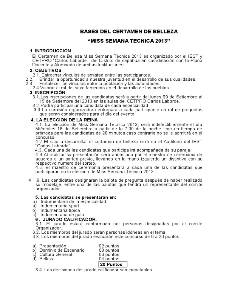 bases parA EL REINADO certamen escolar de belleza elección de la iss ister 2022 institución educativa bases generales presentación. ii. finalidad. el presente.. -Todos los aspectos y hechos propios del concurso no previstos en las bases serán resueltos por la comisión organizadora. Segunda. -El incumplimiento por parte de los candidatos.