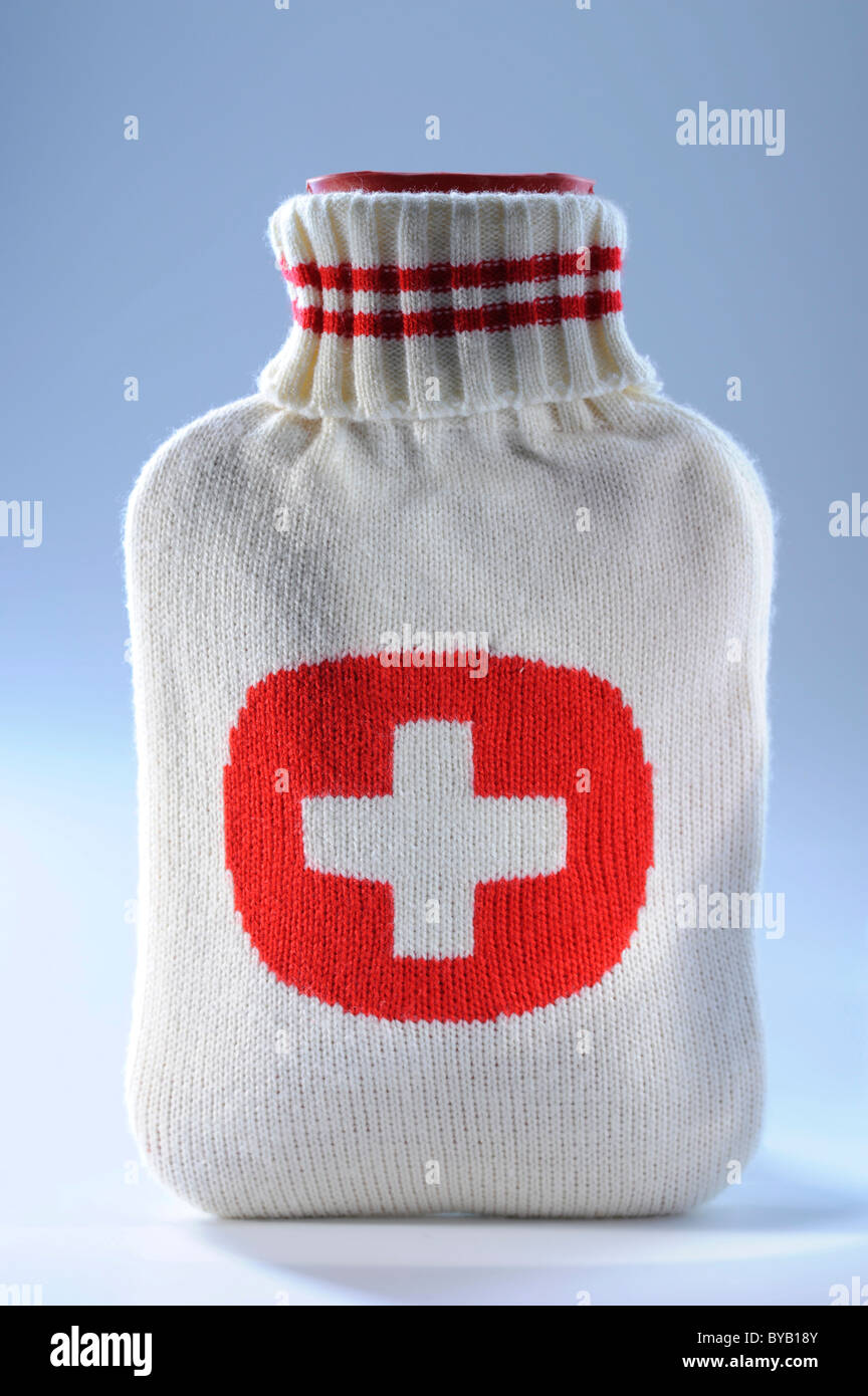 Botella de agua caliente con una cruz roja, botiquín de primeros auxilios Fotografía de stock