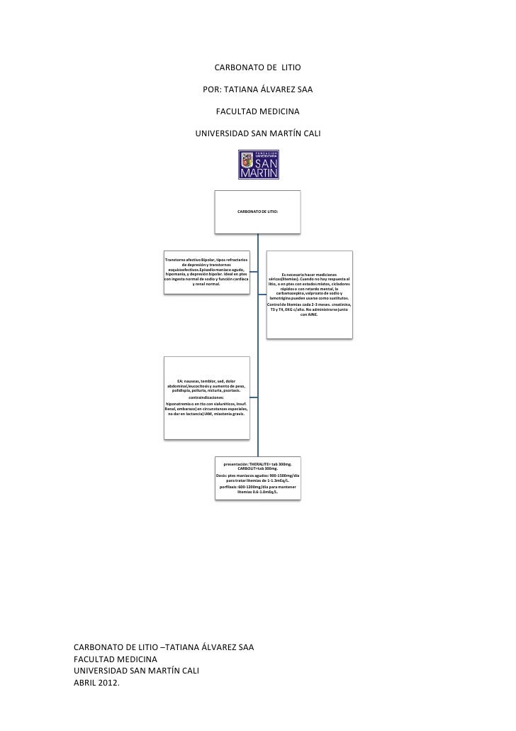 Nombre del producto: CARBONATO DE LITIO Forma farmacéutica: Tableta Fortaleza: 250 mg. El litio es un metal alcalino cuyo mecanismo de acción exacto se desconoce. Se ha postulado que el efecto estabilizante del ánimo se relaciona con una reducción en la concentración del neurotransmisor catecolamina, mediada posiblemente por el efecto.
