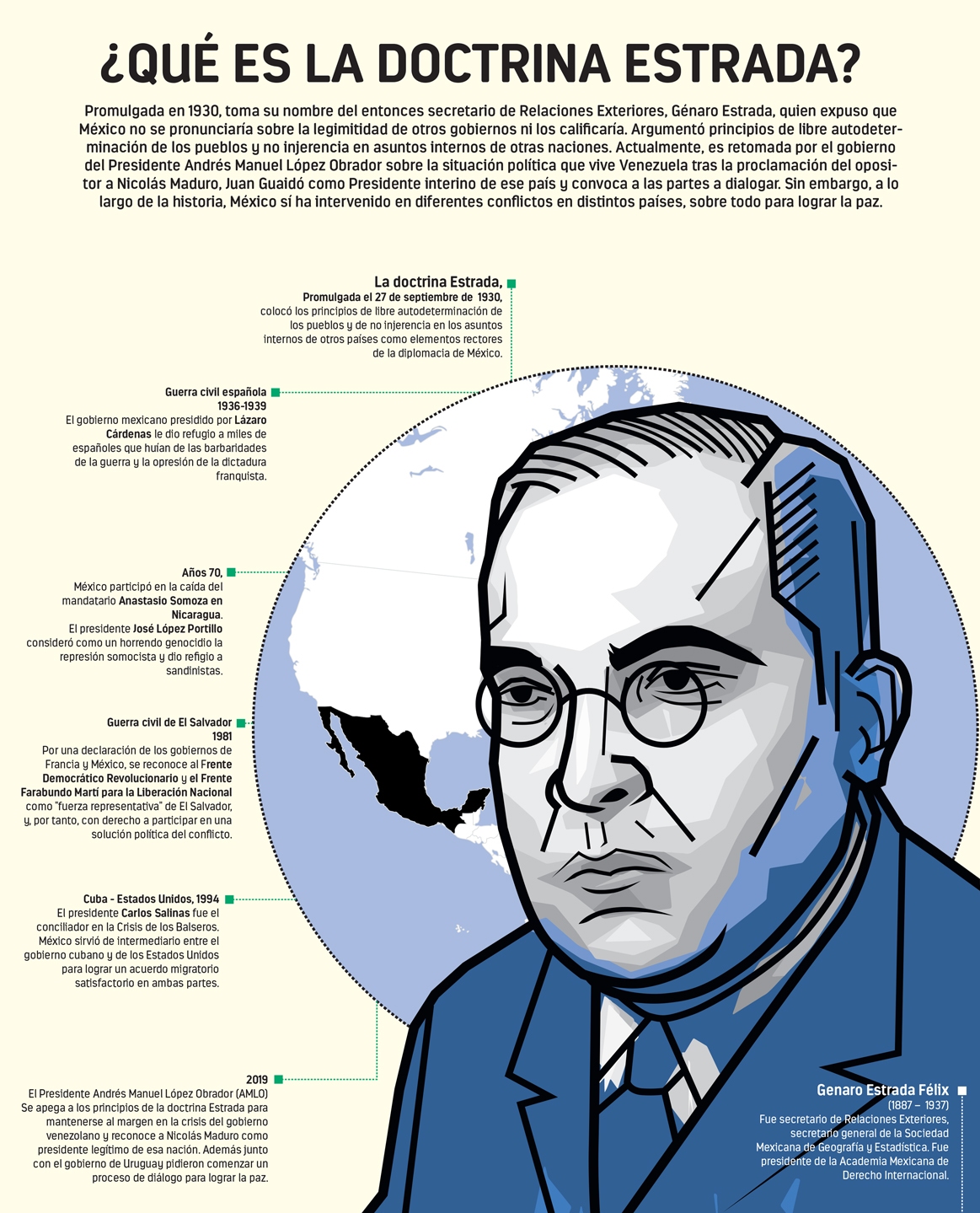 El año 1930 marcó el surgimiento de la doctrina Estrada, una práctica diplomática que imperó en México en el siglo XX y que el Gobierno de Andrés Manuel López Obrador retomó.. La doctrina colocó los principios de libre autodeterminación de los pueblos y de no injerencia en los asuntos internos de otros países como elementos rectores de la diplomacia en México.