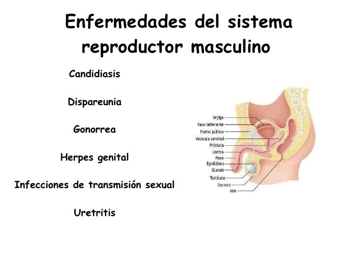 Algunas de las enfermedades más frecuentes que pueden afectar al sistema reproductor masculino son: Hernias inguinales: son abultamientos en la ingle que se producen cuando una parte del intestino o de otro órgano abdominal se desplaza a través de un orificio o debilidad en la pared muscular del abdomen.