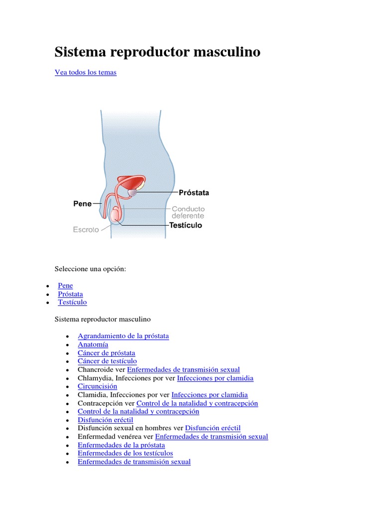 Sistema reproductor masculino. Agrandamiento de la próstata. Anatomía. Anticonceptivos ver Control de la natalidad y contracepción. Cáncer de próstata. Cáncer de testículo. Chancroide ver Enfermedades de transmisión sexual. Chlamydia, Infecciones por ver Infecciones por clamidia. Circuncisión.