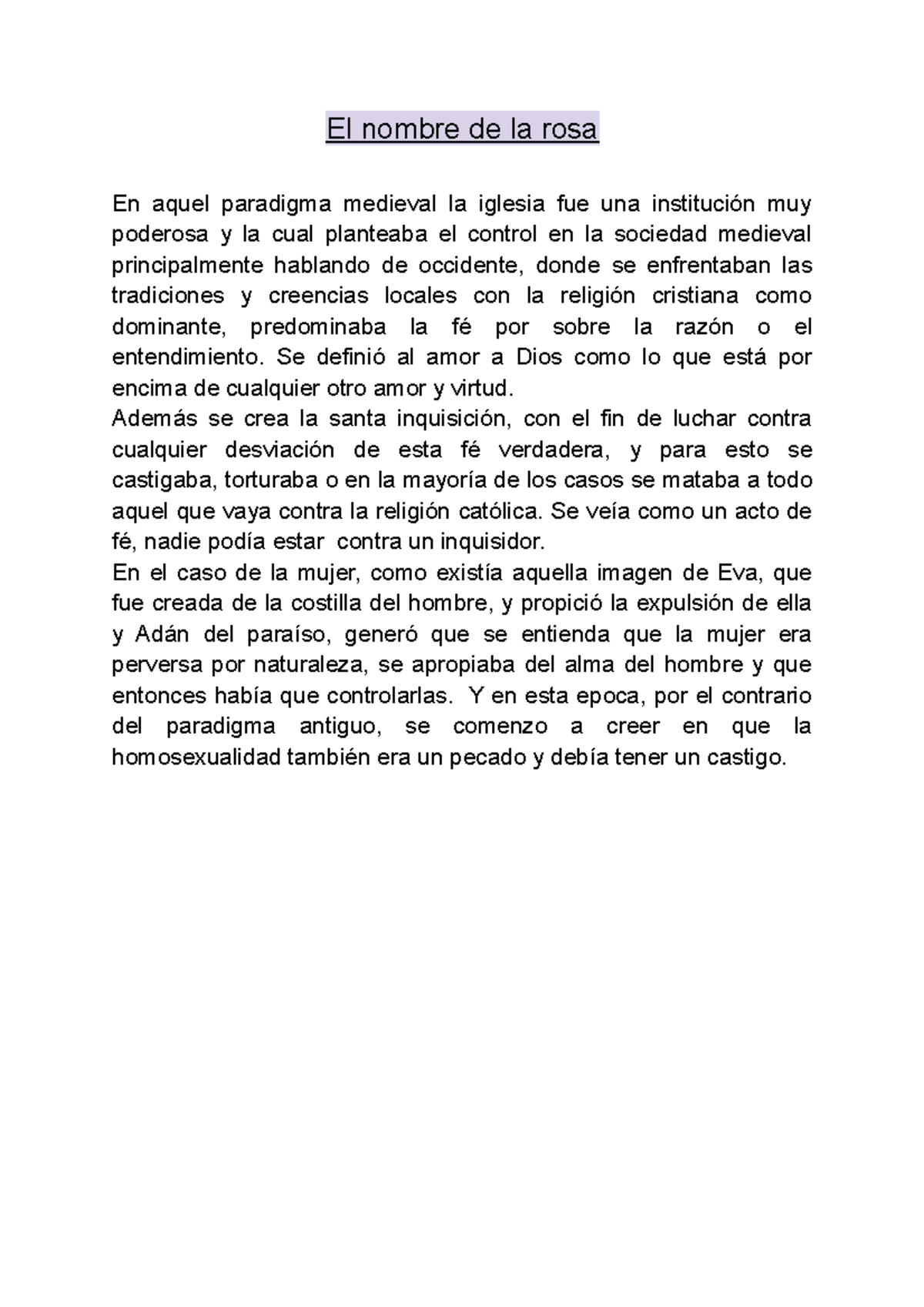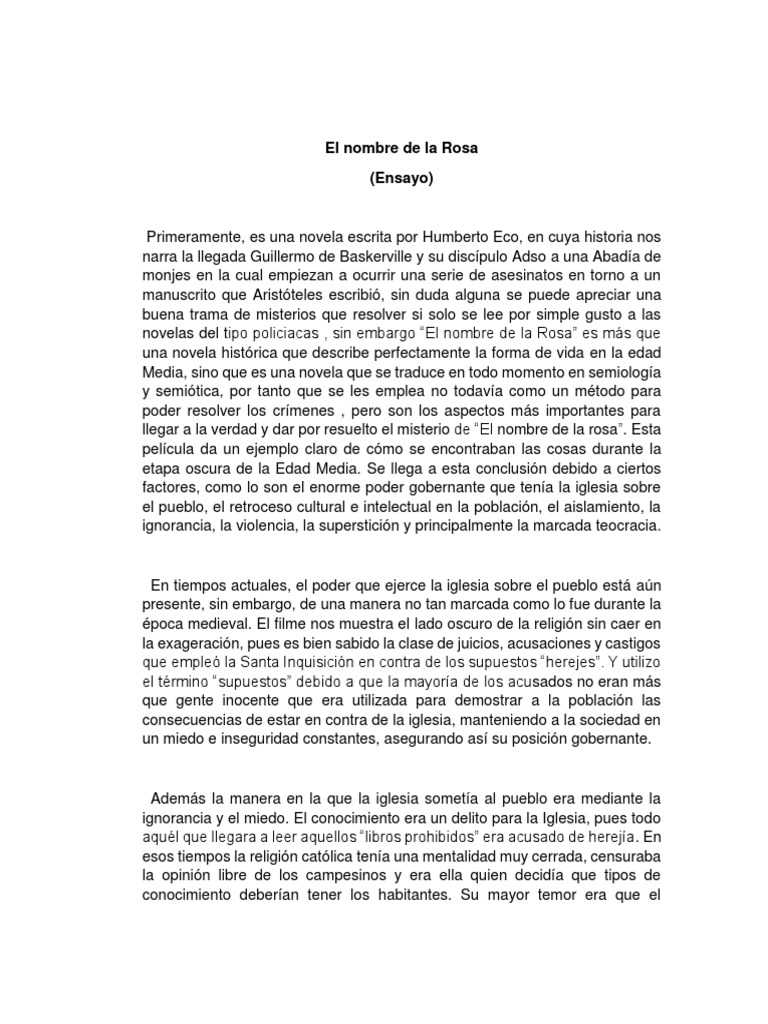 Ensayo sobre la película en NOMBRE DE LA ROSA Ésta película nos da un ejemplo claro de cómo estaban las cosas durante la etapa oscura. 4 Páginas • 34378 Visualizaciones. ENSAYO EN NOMBRE DE LA ROSA. EN NOMBRE DE LA ROSA Una novela escrita por Umberto Eco Una película dirigida por Jean Jacques Annaud INTRODUCCION Es una película.