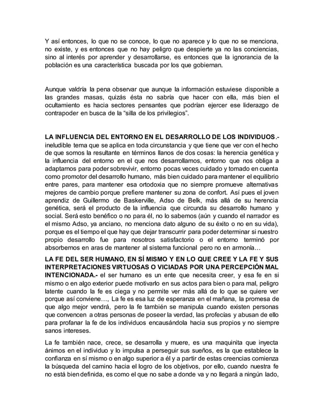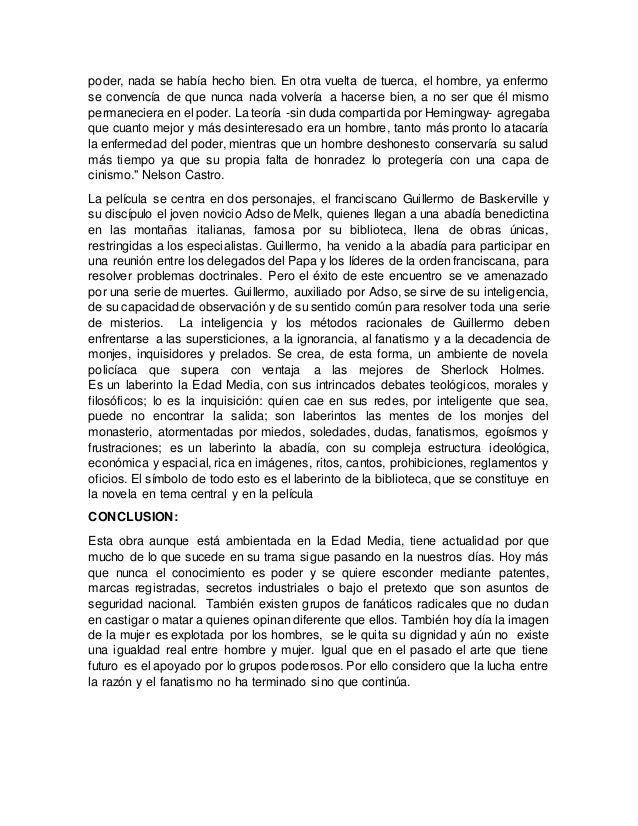 Full text. Ensayo sobre "El Nombre de la Rosa" En la película "El Nombre de la Rosa" (1986) dirigida por Jean-Jacques Annaud y escrita originalmente por Humberto Eco en 1980, apreciamos elementos de interpretación filosófica y de origen racionalistas. El filme se desarrolla en una abadía italiana en el siglo XIV, en la cual se.