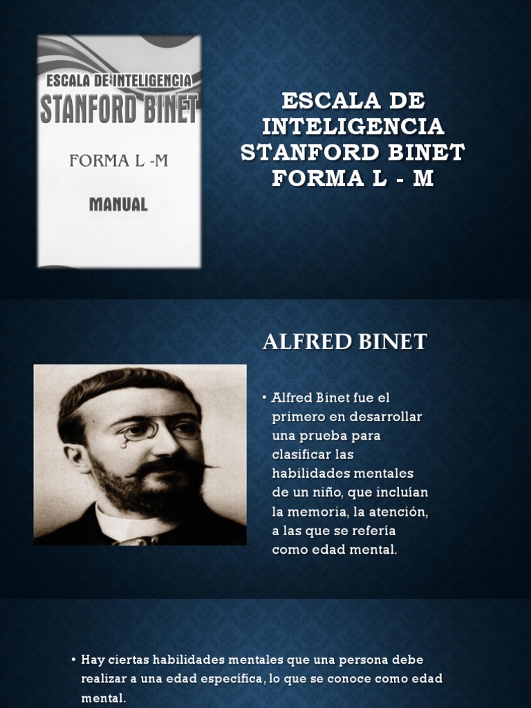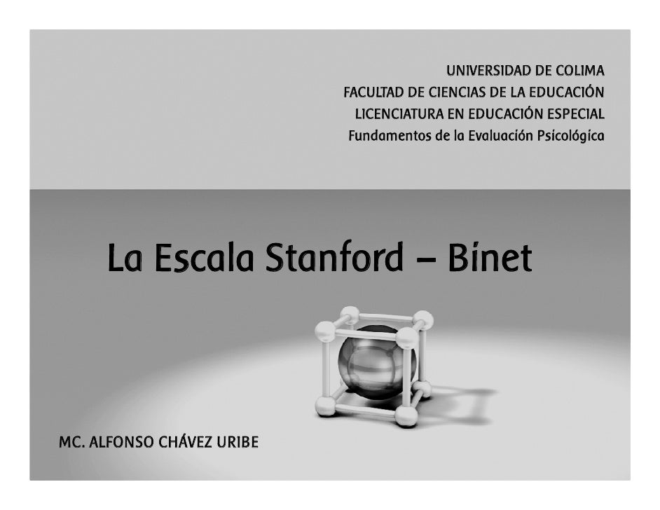 Escala de Stanford Binet. Download Escala de Stanford Binet. BIBLIOGRAFIA • Alfred Binet (Niza, 8/07/1857 - París, 18/10/1911) Se le conoce por su esencial contribución a la psicometría y a la psicología diferencial como diseñador del test de predicción del rendimiento escolar. El test tenía como finalidad práctica y única la de.
