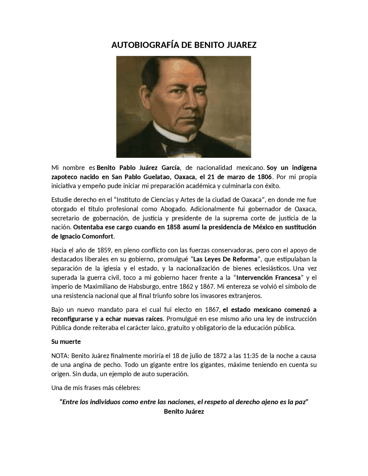 Benito Juárez, autobiografía Resúmenes de Historia Docsity