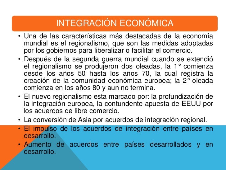 Integración económica. La integración económica es el proceso de eliminación de trabas al comercio entre dos o más países. El objetivo de la integración económica es formar espacios económicos más amplios en los que se puedan aprovechar las ventajas del comercio internacional, como la creciente especialización o el incremento de la.