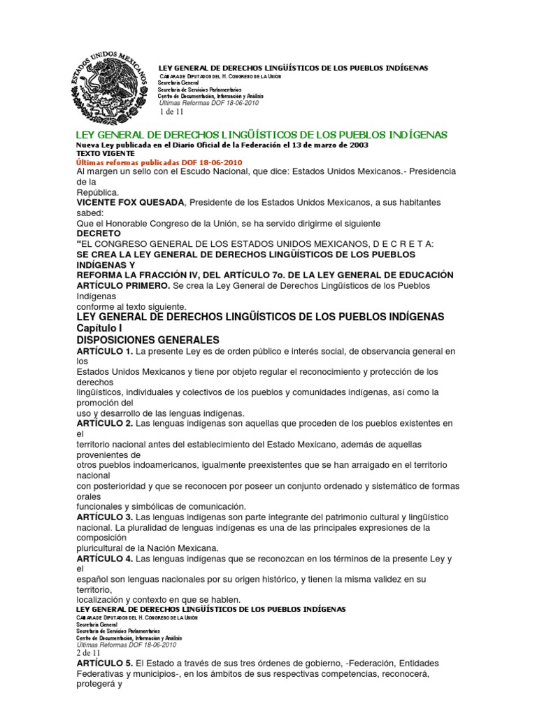 Página 1 de 15 LEY GENERAL DE DERECHOS LINGÜÍSTICOS DE LOS PUEBLOS INDÍGENAS Al margen un sello con el Escudo Nacional, que dice: Estados Unidos Mexicanos.- Presidencia de la República. VICENTE FOX QUESADA, Presidente de los Estados Unidos Mexicanos, a sus habitantes sabed: Que el Honorable Congreso de la Unión, se ha servido dirigirme el.