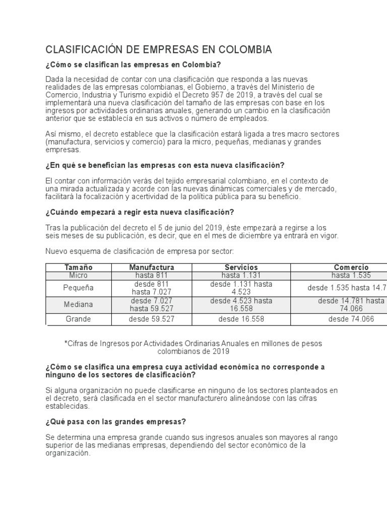 Clasificación de Empresas en Colombia PDF Colombia Sector terciario de la economía