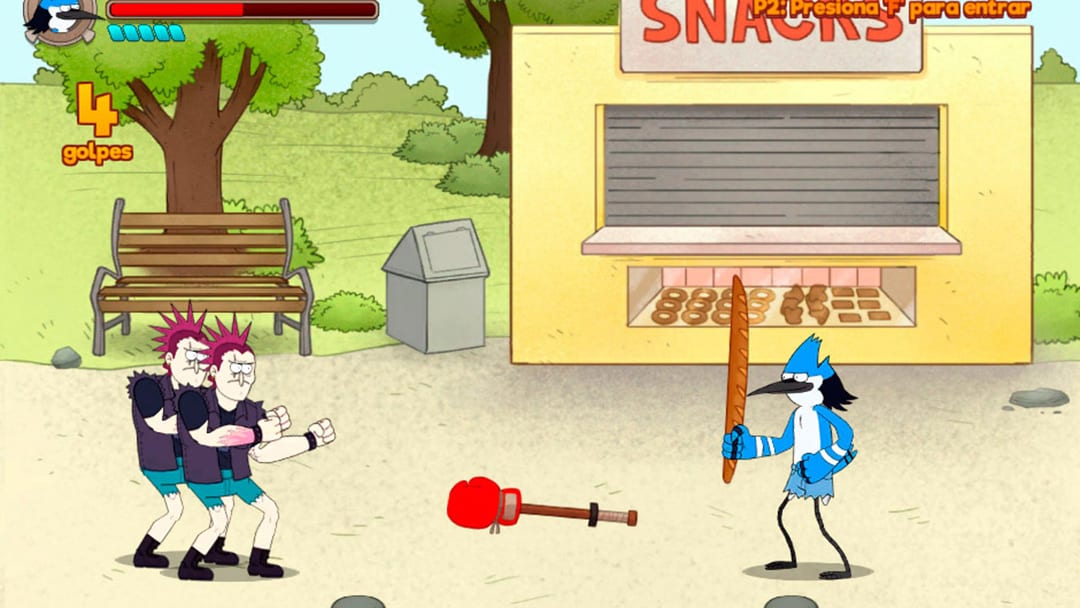 Pelea con los enemigos uniformados con las patadas y golpes de los únicos Mordecai y Rigby de Un show más. Elige a uno de estos personajes o juega con un amigo mostrando las habilidades del arte marcial inventada por ellos. Recorre las aventuras de locos con estos personajes que solo quieren pasar al próximo nivel y enfrentarse al Gran jefe.