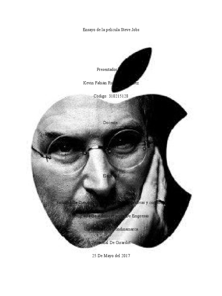 Página 1 de 4. ENSAYO SOBRE LA PELICULA DE STEVE JOBS. UNIVERSIDAD DE SAN JOSE, NICOYA. ALUMNO: LUIS ALBERTO FONSECA CASTILLO. FUNDAMENTOS DE LA COMPUTACION, PROF: LUIS ARROYO. Steve Jobs, un hombre exitoso, que no termino la universidad sin embargo esto no lo limito para alcanzar el éxito, sino todo lo contrario las decisiones que en su.