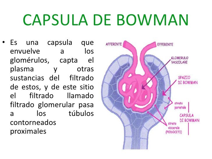 El cuerpo controla activamente muchos de estos procesos para poder regular la composición de los fluidos corporales. Finalmente, la orina restante drena a través de un tubo llamado conducto colector hacia la pelvis renal, el uréter y la vejiga. La cápsula de Bowman, también conocida como cápsula glomerular o cápsula glomérula, es una.