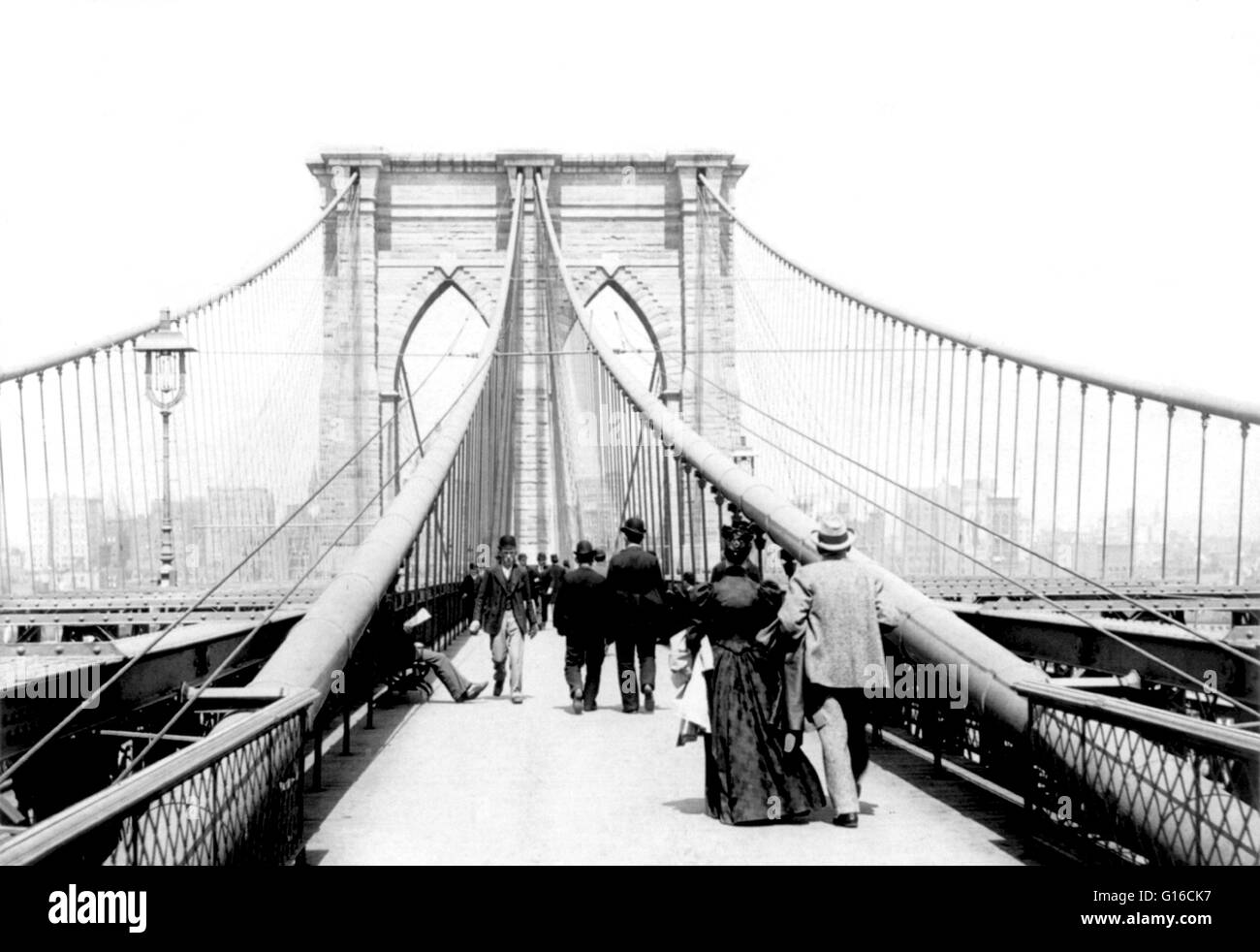 Vista sobre el puente de Brooklyn, N.Y.C. con gente caminando en ambas direcciones, de 1894. El