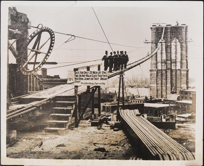 Obra maestra de John Augustus Roebling, el Puente de Brooklyn se construyó (1869-1883) frente a inmensas dificultades. Roebling, un ingeniero, había desarrollado su propio método para tejer cables, que se convirtió en uno de los principales componentes de construcción de sus diseños de puentes. Construyó una serie de puentes colgantes.