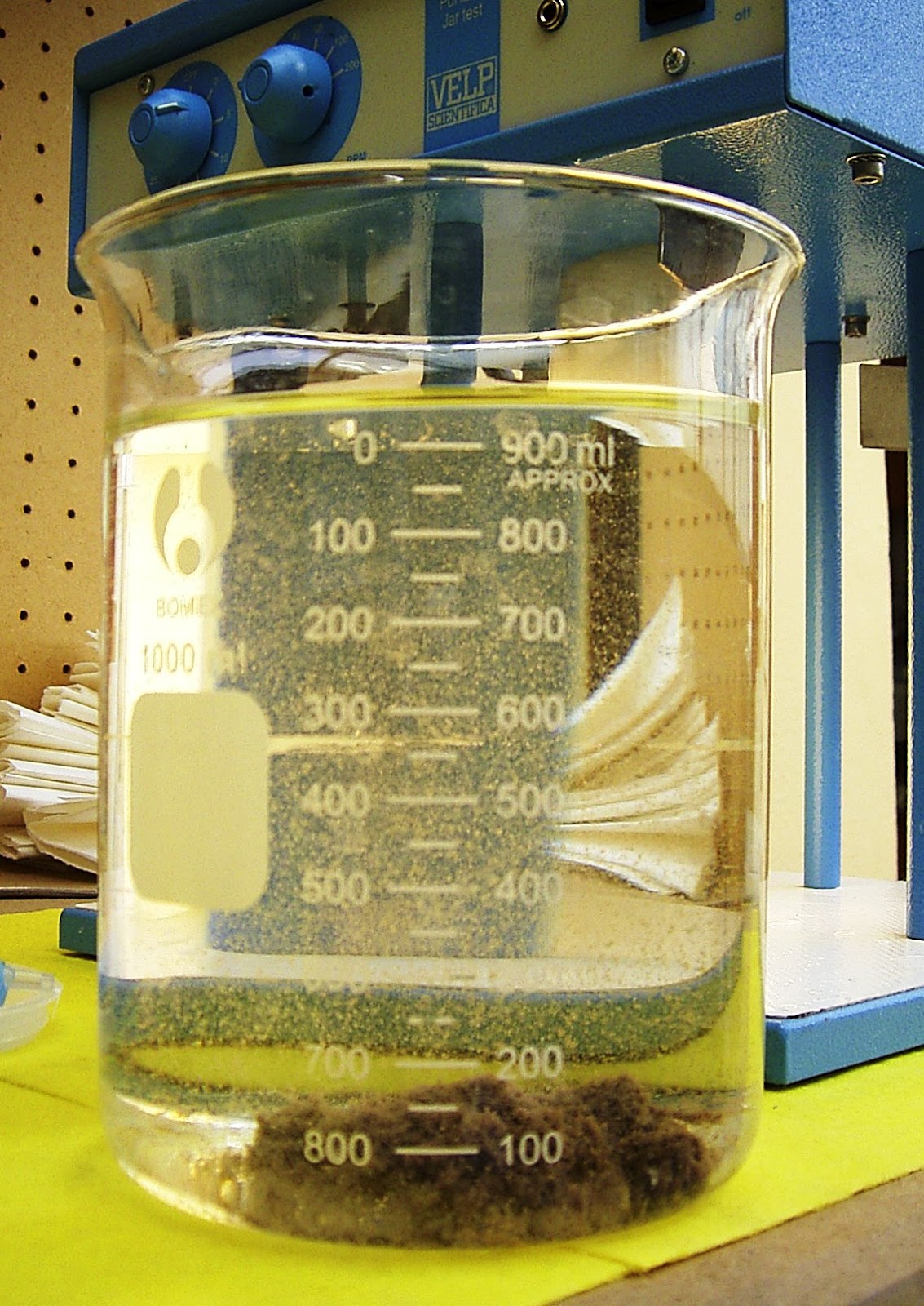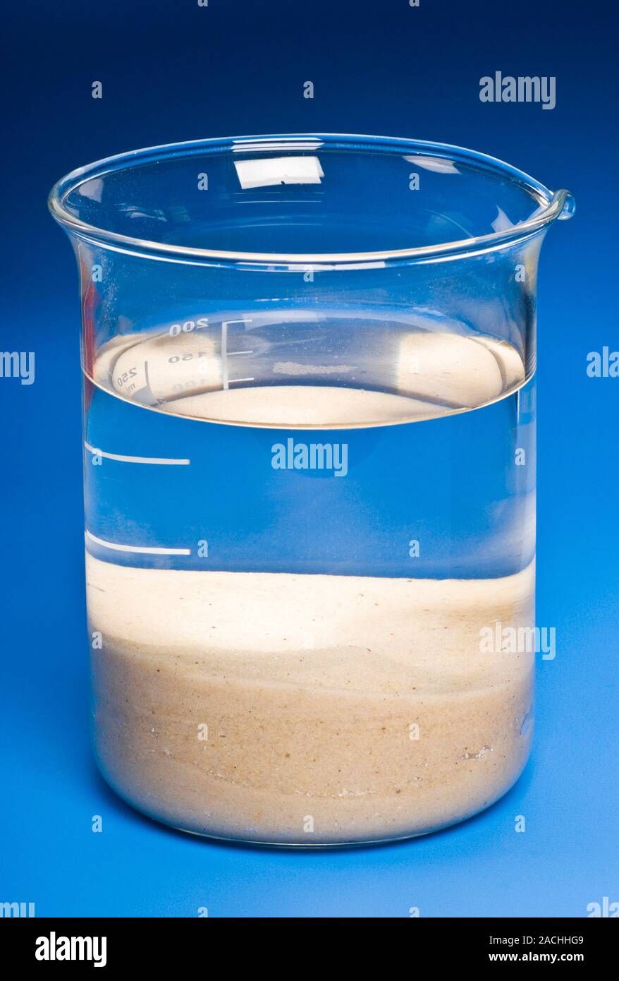 Sedimentation experiment. When a sand and water mixture is left in a beaker, the sediment will