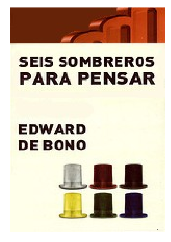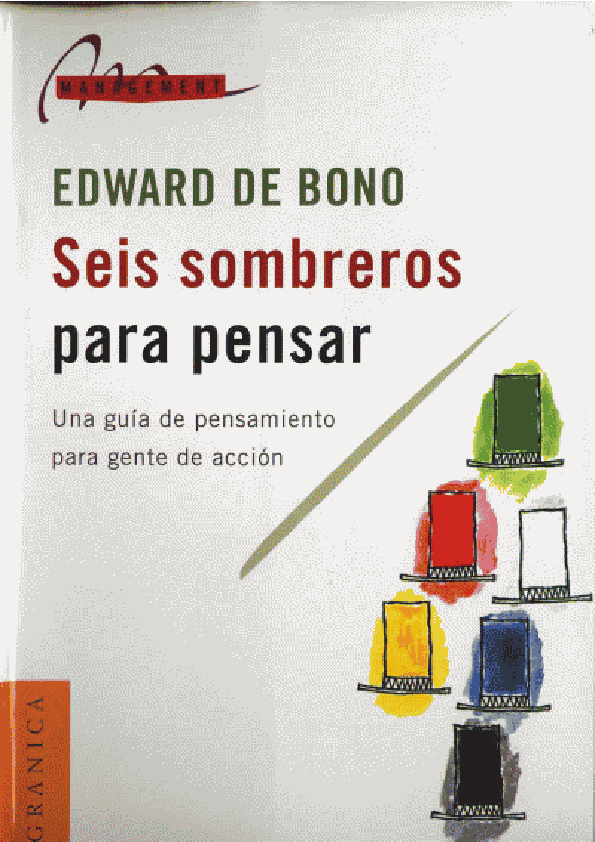 Books. Seis sombreros para pensar. Edward De Bono. Vergara, 1988 - Problem solving - 222 pages. CONTENIDO: "Actuar como si". Si actúas como un pensador, te convertidas en uno de ellos - Intención y desempeño - La melancolía y otros fluidos - Seis sombreros, seis colores - El sombrero blanco. Hechos y cifras - El sombrero rojo.