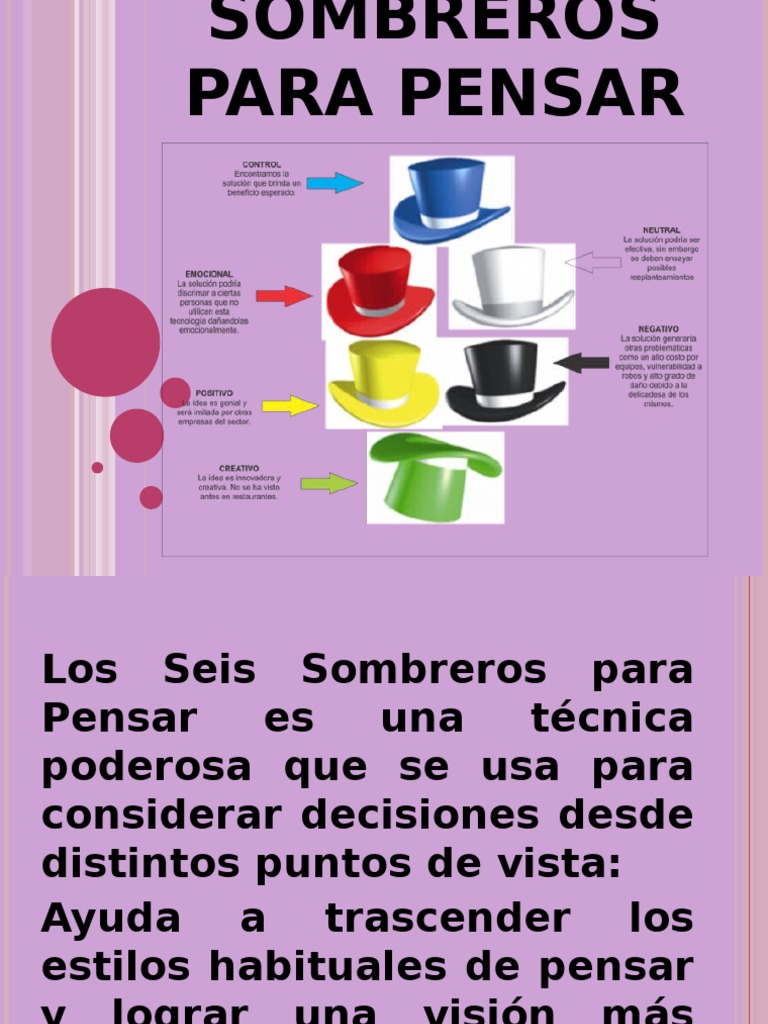 1. ¿Qué es la técnica "Seis sombreros para pensar"? El método "Seis sombreros para pensar" fue inventado por Edward de Bono a comienzos de 1980. Los seis sombreros representan seis modos de pensar difer-entes y ofrecen pautas de pensamiento en lugar de ser simples etiquetas. Los som-breros se emplean de manera proactiva más que.