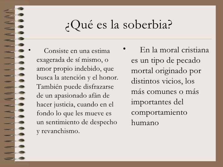Soberbia. La soberbia es el amor excesivo de la propia excelencia. Se cuenta ordinariamente entre los siete pecados capitales. Santo Tomás, sin embargo, confirmando la opinión de San Gregorio, lo considera el rey de todos los vicios, y pone en su lugar la vanagloria como uno de los pecados capitales. Al darle esta preeminencia lo toma en su.