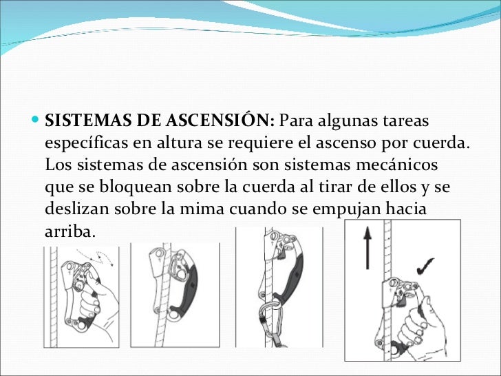 Sistemas de descenso. Para acceder a algunos espacios, el trabajador debe descender por cuerdas fijas trasmitiendo la carga a los puntos de anclajes superiores. El principio de funcionamiento es sencillo: el sistema genera rozamiento entre sus partes y la cuerda para permitir controlar el descenso, y cuando se requiere bloquea el sistema.