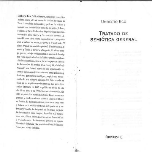 opensource. Tratado General de Semiótica para la realización de diferentes investigaciones entorno a esta área del conocimiento. Addeddate. 2021-01-29 20:36:11. Identifier. umberto-eco-tratado-de-semiotica-general. Identifier-ark. ark:/13960/t09x0hn32. Ocr.