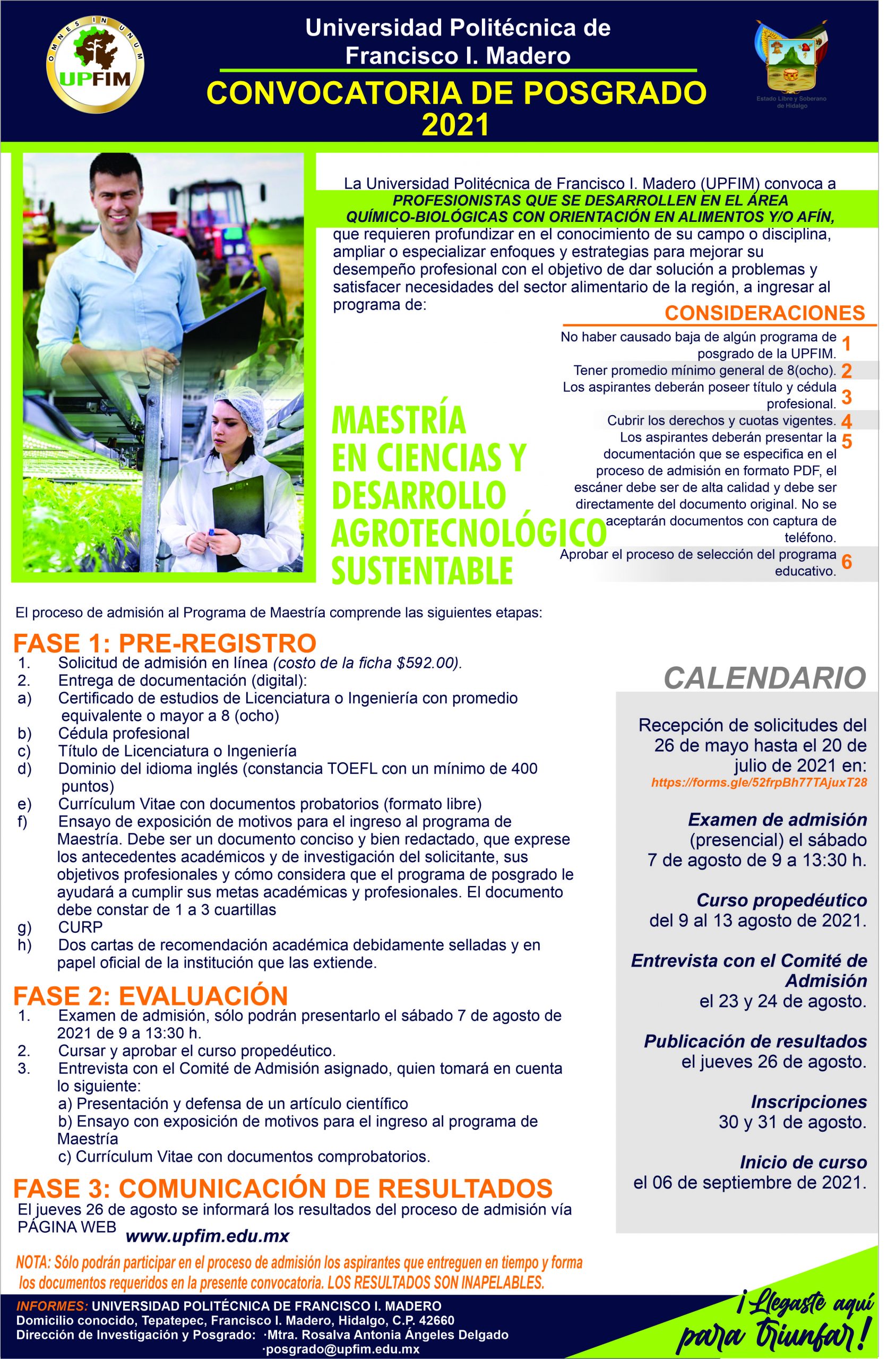 Maestría en Ciencias en Desarrollo Agrotecnológico Sustentable. Más información. Formar recursos humanos con capacidad para realizar investigación científica en los sistemas de producción agropecuario que generen nuevas tecnologías enfocadas al desarrollo sustentable.