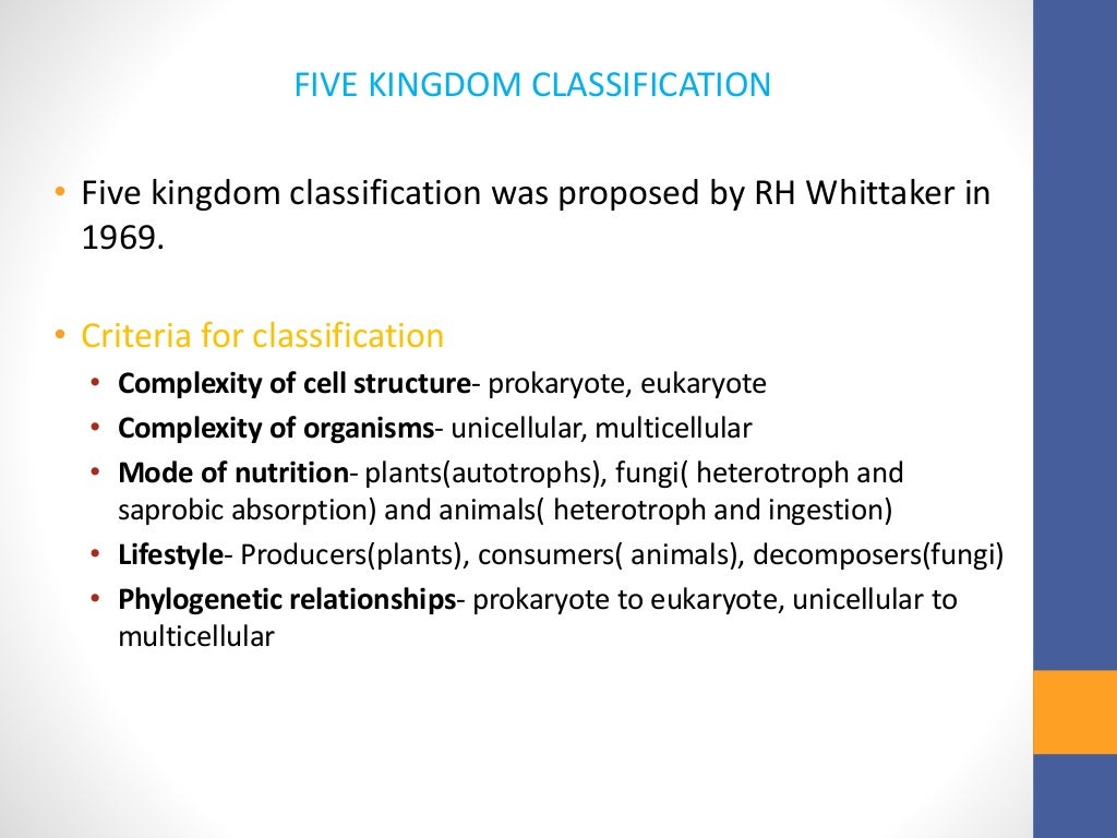 In 1969, Robert H. Whittaker proposed a Five- Kingdom System of Classification, in which all organisms are placed into five kingdoms. Features of Five Kingdom System of Classification Whitaker proposed that organisms should be broadly divided into kingdoms, based on certain characters like the structure of the cell, mode of nutrition, the.